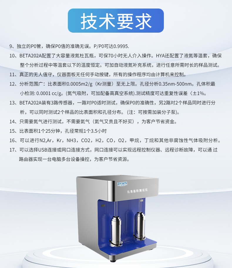 16. 可以進行N2,Ar,Kr,NH3,CO2,H2,CO,O2,甲烷,丁烷和其他非腐蝕性氣體吸附分析。