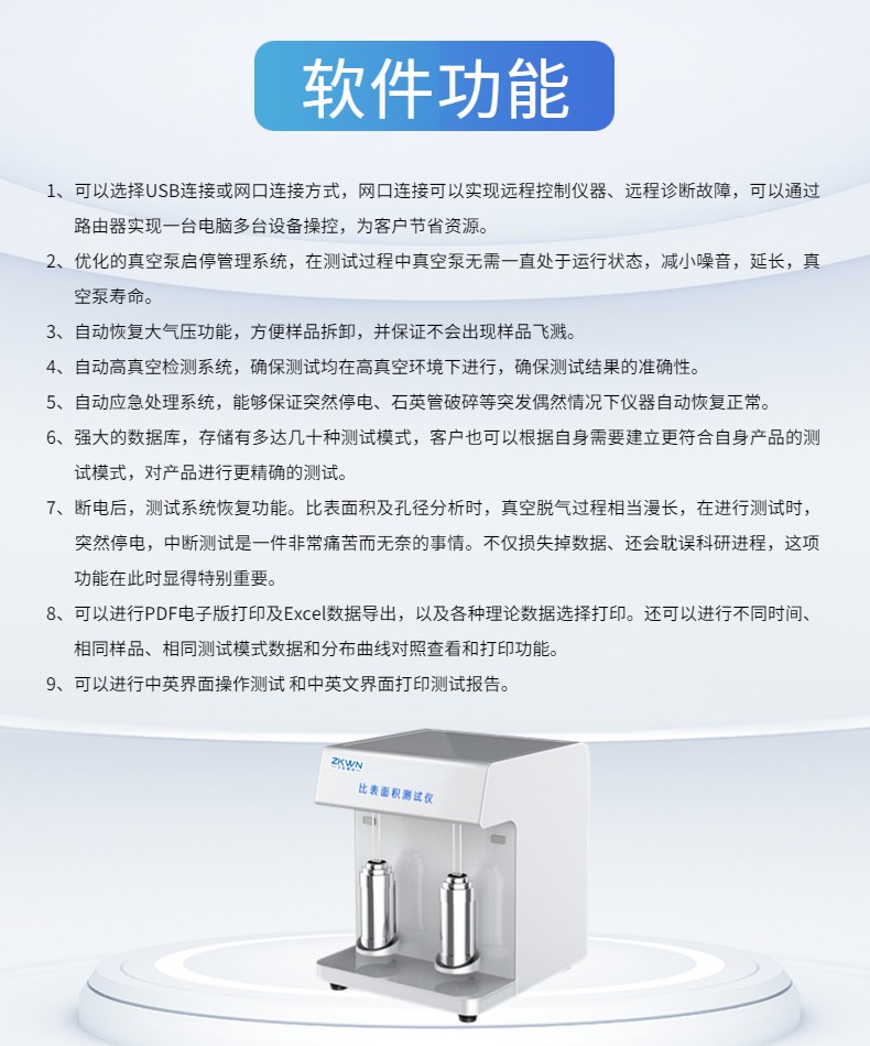 12. 分析范圍廣:比表面積0.0005m2/g(Kr測量)至無上限??讖椒治?.35nm-500nm??左w積小檢測: 0.0001 cc/g。(氮氣吸附,可加配備高真空系統).測試精度可達重復性誤差〈±1%。