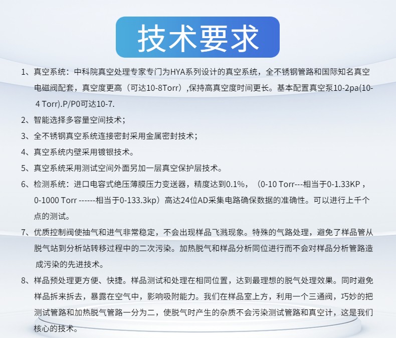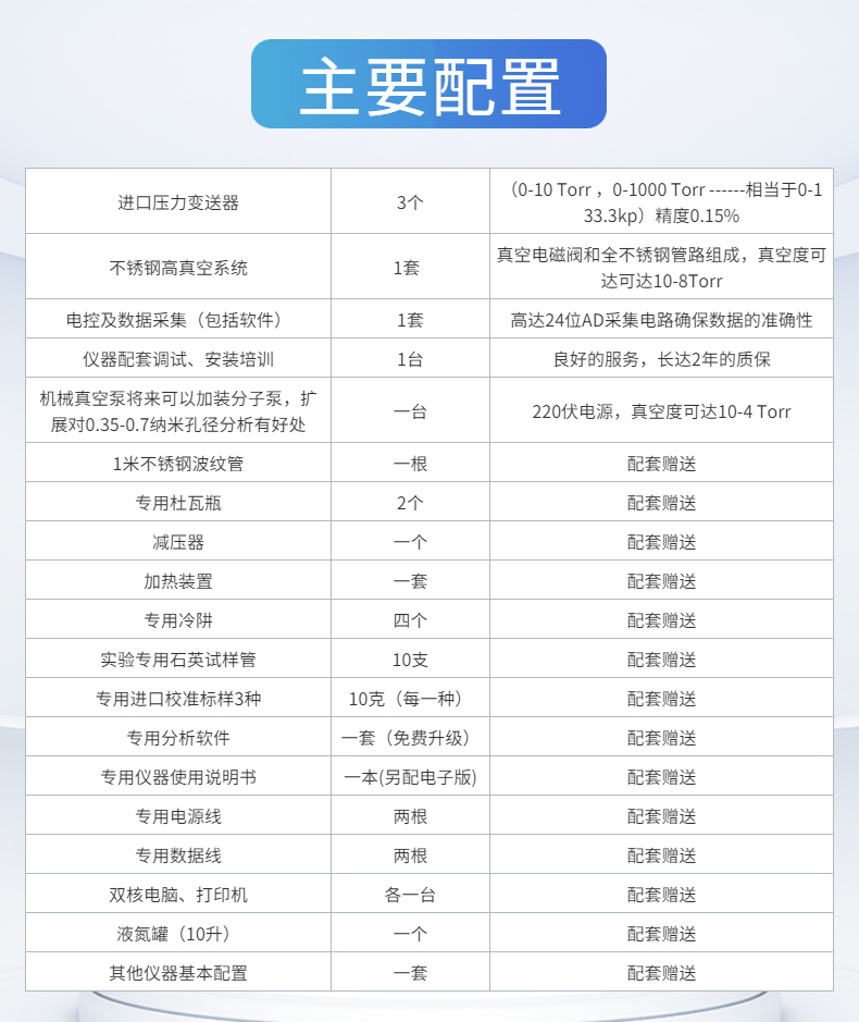 1. 真空系統:中科院真空處理專門為該系列設計的真空系統,全不銹鋼管路和國際真空電磁閥配套,真空度更高(可達10-8Torr),保持高真空度時間更長。基本配置真空泵10-2pa(10-4 Torr).P/P0可達10-7.